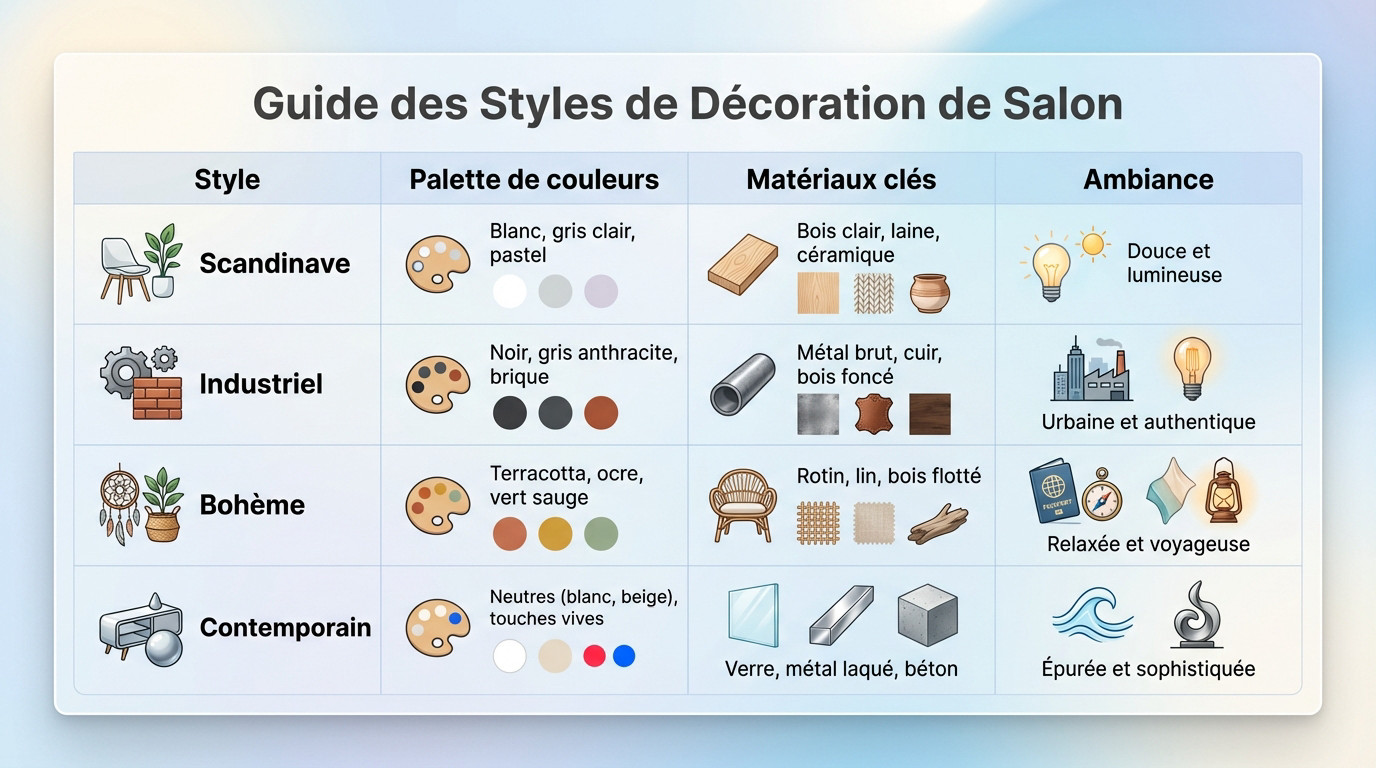 | Style | Palette de couleurs | Matériaux clés | Ambiance |