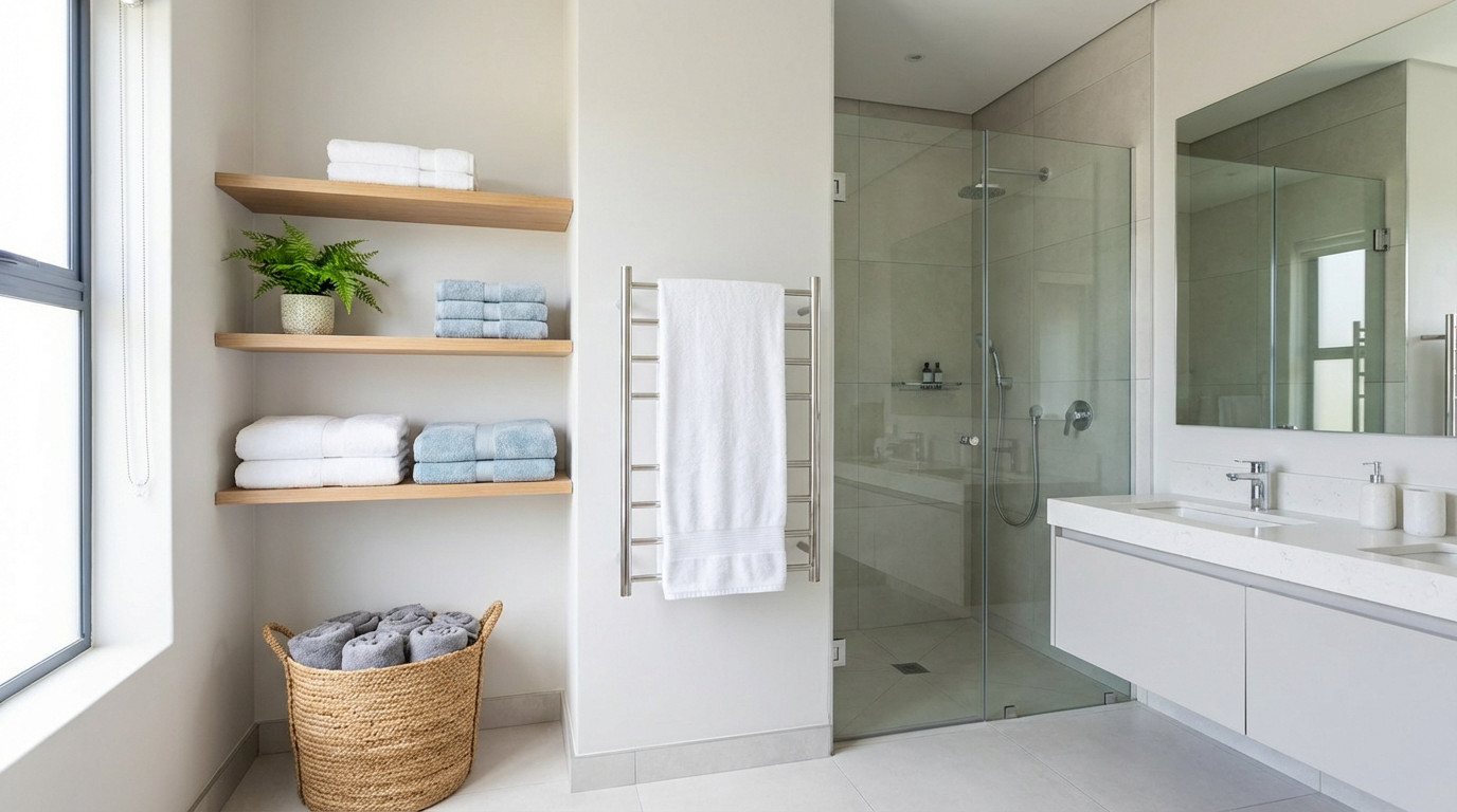 Les étagères murales transforment le stock de propre en atout. Pliées ou roulées, vos serviettes deviennent un véritable élément décoratif. C’est le rangement qui s’assume.